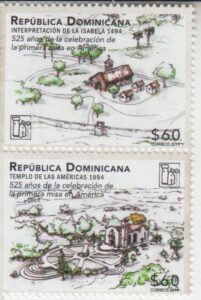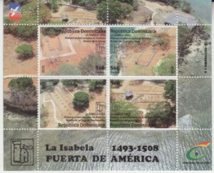 En ocasión de conmemorarse los 525 años de la Primera Misa, Primera Iglesia y Primer Sitio Histórico  en América, La Isabela, ( Puerto Plata) , el Director del Inposdom en compañía del Ministro de Cultura y   de la Directora Ejecutiva de la Fundación La Isabela,  pusieron en circulación el pasado 10 de este mes de diciembre, una nueva serie postal contentiva de dos sellos en se-tenant y un bloque de 4 sellos con las imágenes de los restos arqueológicos de la iglesia , alhondiga y cementerio.