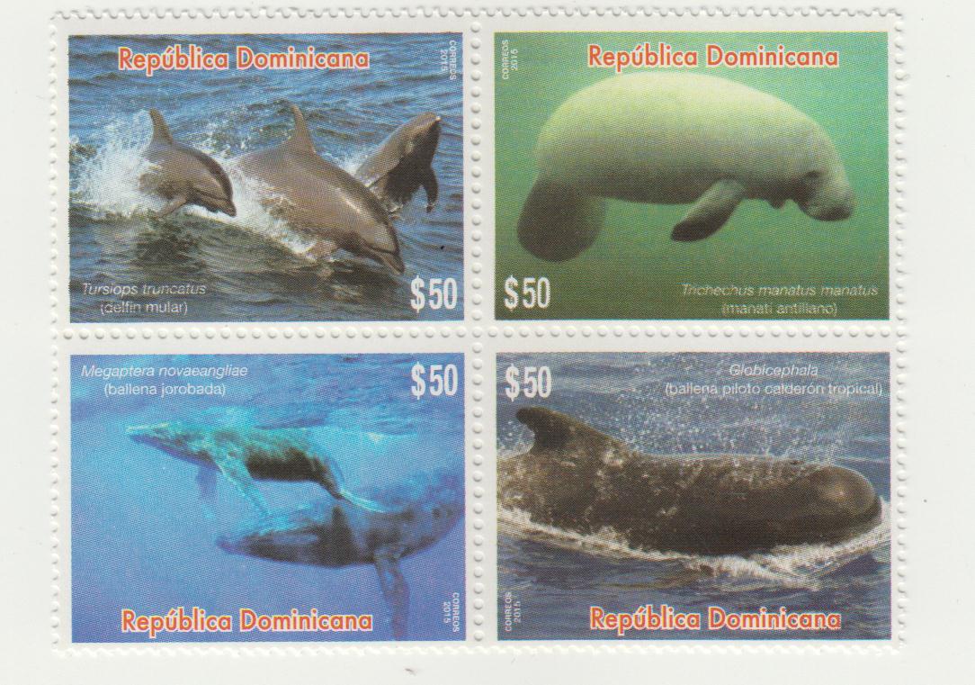 ( pendientes del pasado año) con diferentes especies de la fauna marina que rondan las costas dominicanas. Las especies seleccionadas son la ballena jorobada, el manatí, la ballena piloto y los delfines. El valor de los sellos es de RD $50.00 y de la serie completa RD $200.00. Los sellos fueron impresos por la Litografía Ferrúa y Hnos. bajo el aval del decreto 75-15 de fecha 06-03-2015.