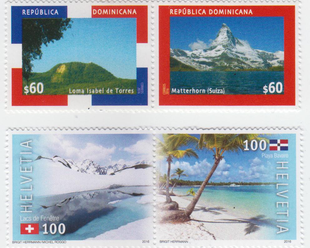 Tomando como referencia estas similitudes, para esta emisión conjunta, hemos seleccionado dos temáticas representativas de las semejanzas entre las azules aguas de nuestras playas y lagos ( Playa Bávaro y los Lagos de Fenetre ) y del relieve de nuestra geografía, por lo que se han elegido dos reconocidas montañas, la loma Isabel de Torres y el Pico Matterhorn).