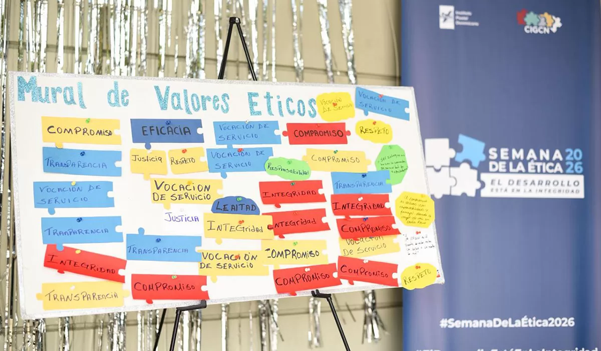 Como apertura de la semana, la institución recibió a sus colaboradores con un mural de valores éticos, una dinámica participativa que permitió promover la reflexión sobre principios fundamentales como la honestidad, responsabilidad, respeto, compromiso y transparencia, fortaleciendo el sentido de pertenencia y la conciencia institucional sobre la integridad en el ejercicio de la función pública.